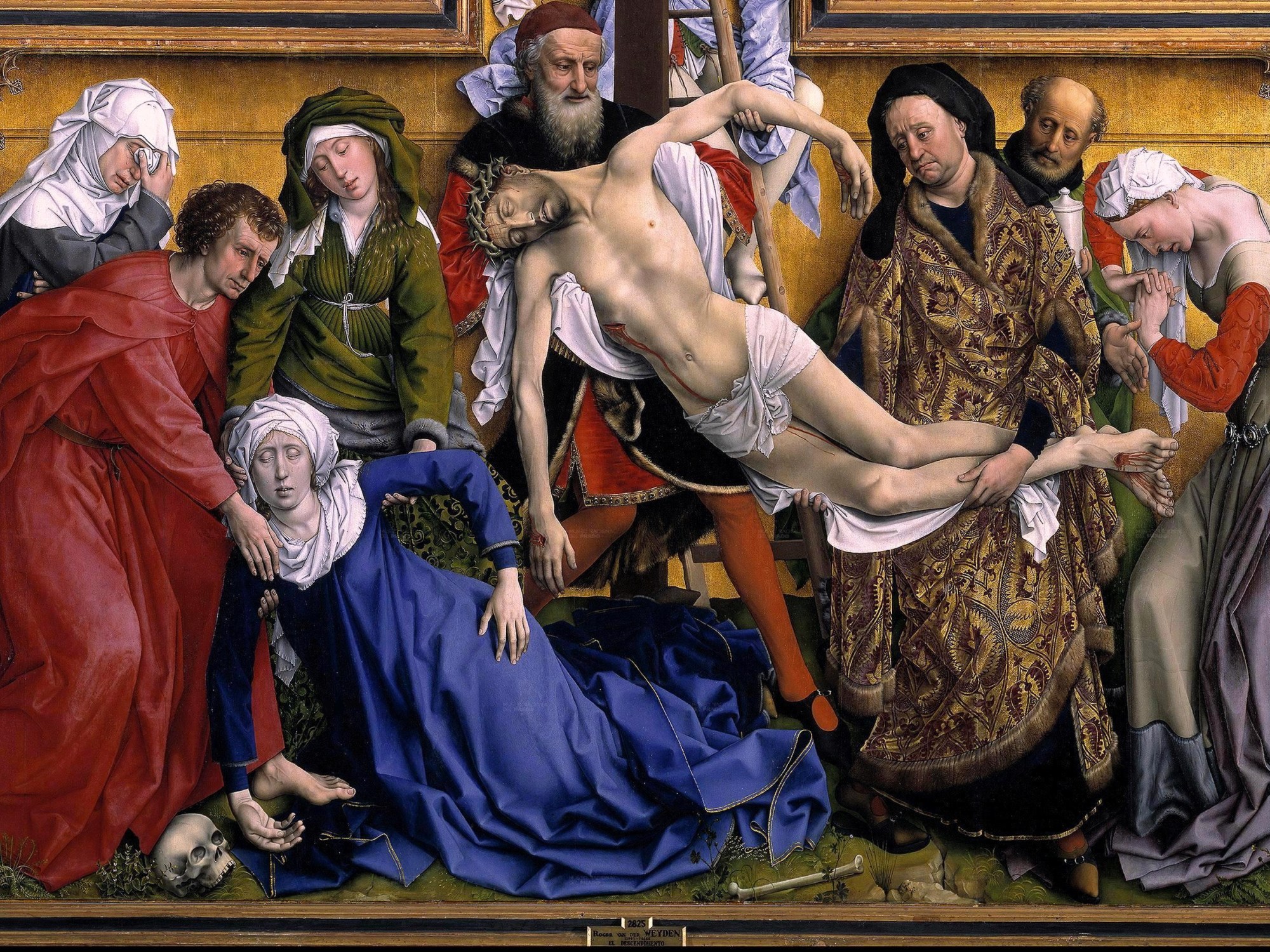 Rogier Van Der Weyden’s “The Deposition of Christ,” was copied ad-nauseam after its spark of genius lit fire to the imaginations of the 15th century Flemish circle of artists. It is perhaps one of the most recreated and influential Christian paintings in all of art history. Like a great jazz standard or a classical piece of music, the work’s content evolves from artist to artist, it is muted, manipulated, and re-birthed continuously, but the pleasure of the repetition of its core composition resounds. Repetition penetrates its immediate structure, for each figure there is another forming an expanding symmetry.