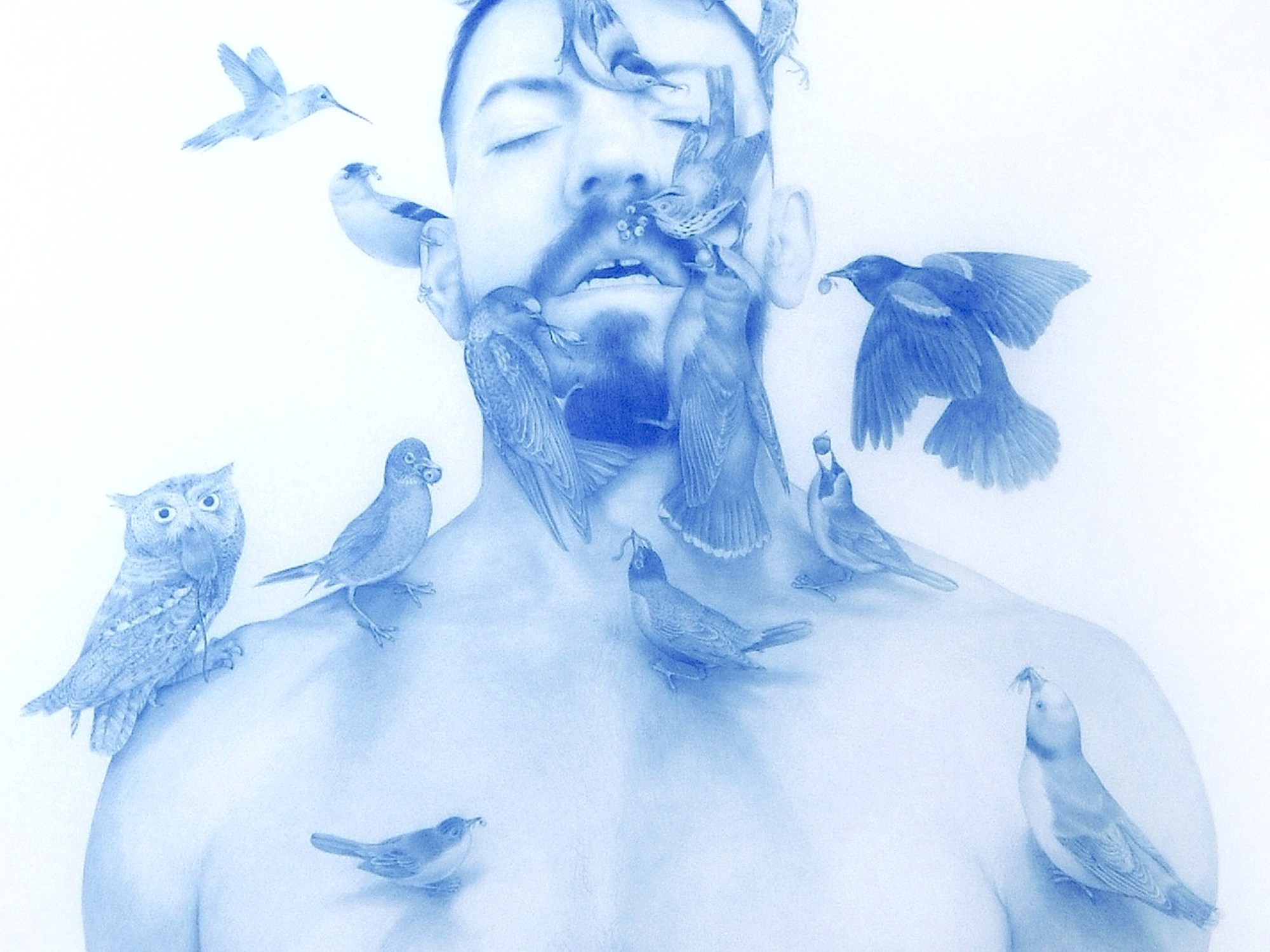 ZL: I see this element in my work of role and gaze reversal, about challenging gender norms and ways in which bodies have been and continue to be codified socially, but I extend this queering of convention to the conversation of challenging notions of speciesism that is rife throughout Human culture and society. Most humans feel superior to other animals. We are not. We can take advantage in certain ways because of our biology, but we are not an inherently better species, in fact, in my opinion, in many ways we are collectively an inferior animal. In my series of drawings from the Feeding series, which is an offshoot of my ‘Wild Men’, I depict myself being fed by birds; this simple shift or reversal of roles revels my thinking on this matter. It is very common throughout the world to see people in parks feeding birds, I just reversed this act as a question to viewers- would you ever be fed by a bird? What might that feel like? It would be a revolutionary act to listen and allow other species to teach humans about the world around us. This also reminds me of a much earlier drawing from 2011, Emperor’s New Clothes, in which I depict myself swarming with Monarch butterflies. The title, a double entandre, referencing the monarch as emperor, my own nudity and ideas of collective conformity, but its genesis as an image ingrained itself in my mind after hearing from a cousin who’d visited the mariposa in Mexico, that at times there are so many of these insects on a given tree that branches can break off due to their weight; and so, in imagining my body as that tree, I had an extreme desire to embody that experience, as a spectacle of nature.